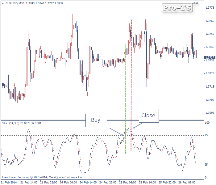 Для поиска коррекции подойдут индикаторы-осцилляторы. Взяв, к примеру, стохастик, можно использовать стандартный период. Но используем только на дневном графике, поскольку у нас долгосрочный тренд.
